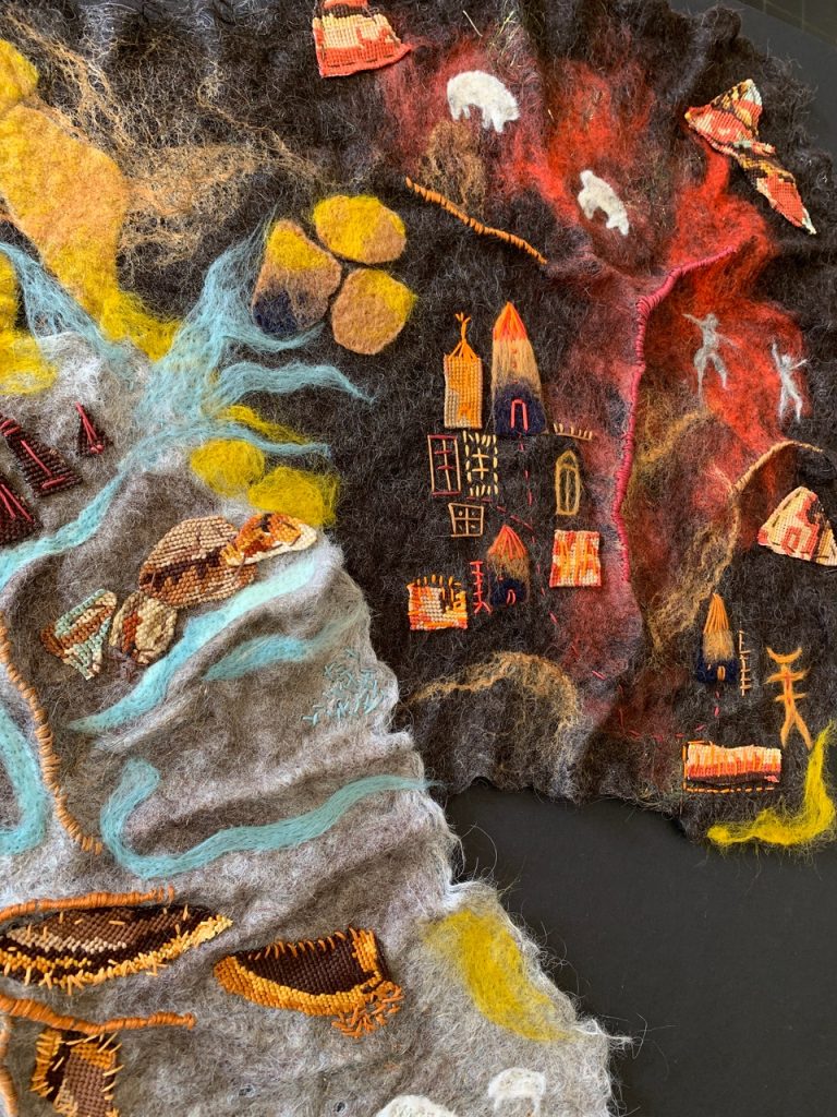 Laine et feutre sont donc des « matériaux fétiches » qui accompagnent mes « chantiers de fouilles » imaginaires : ils incarnent cette connexion avec la « nature » et le cosmos que nous avons perdu et que nous enseigne les « peuples premiers ».