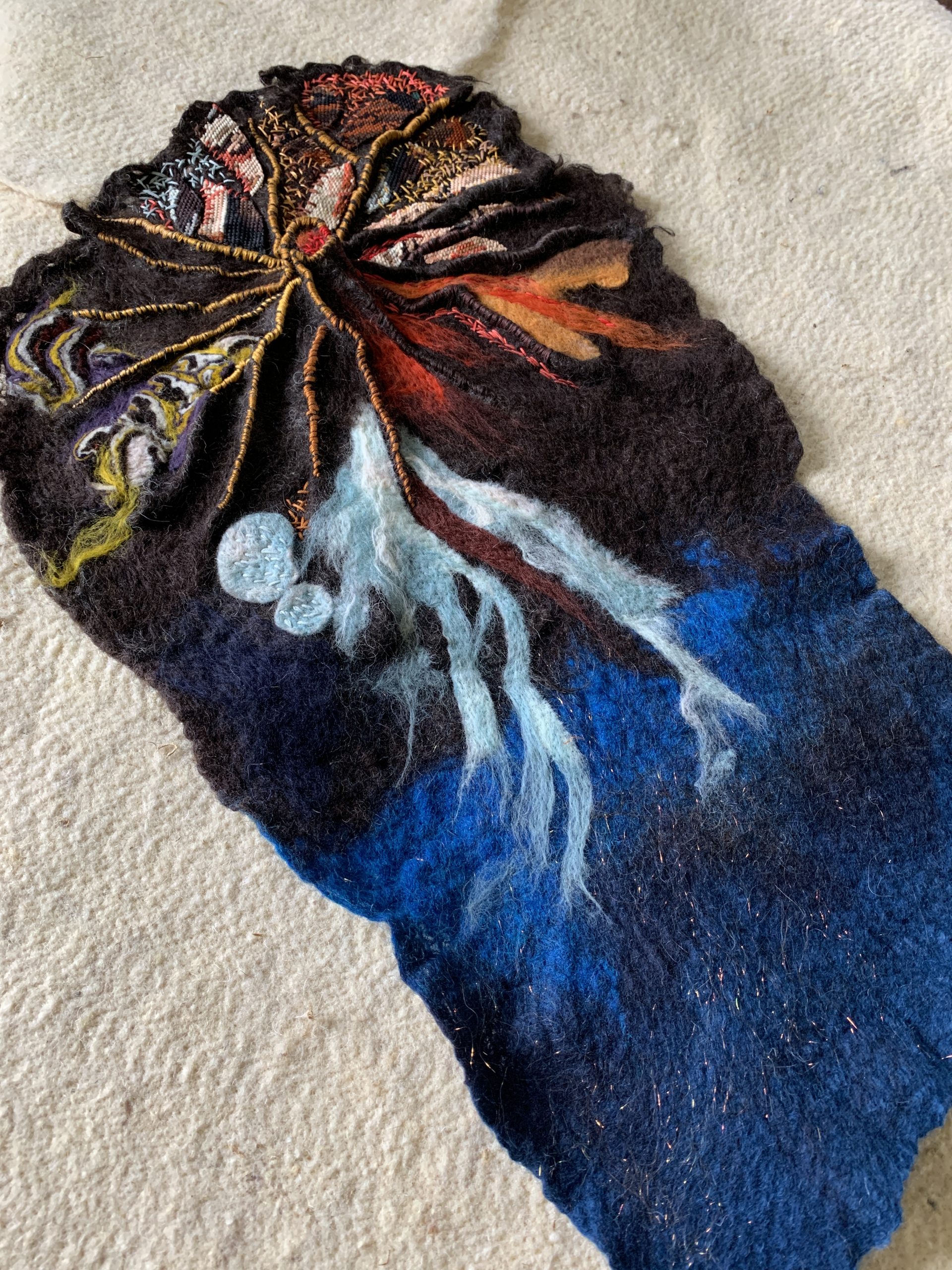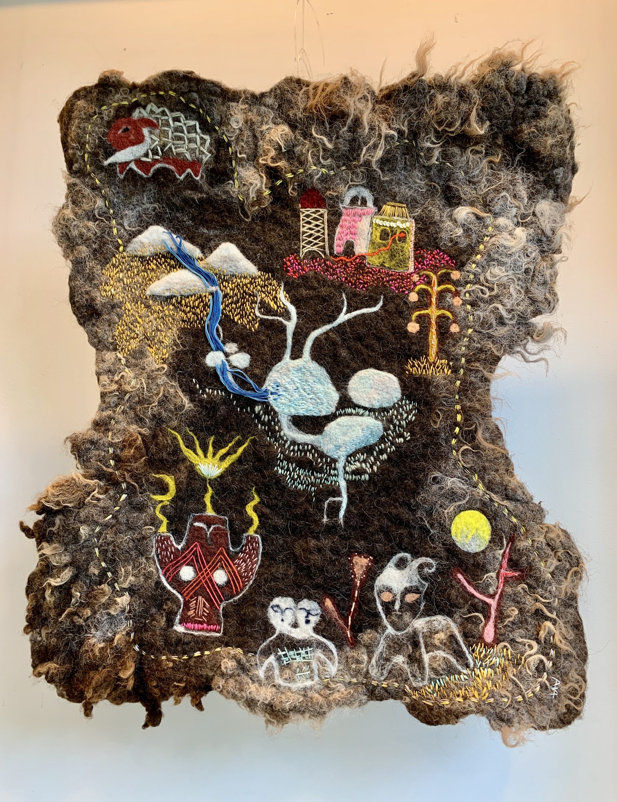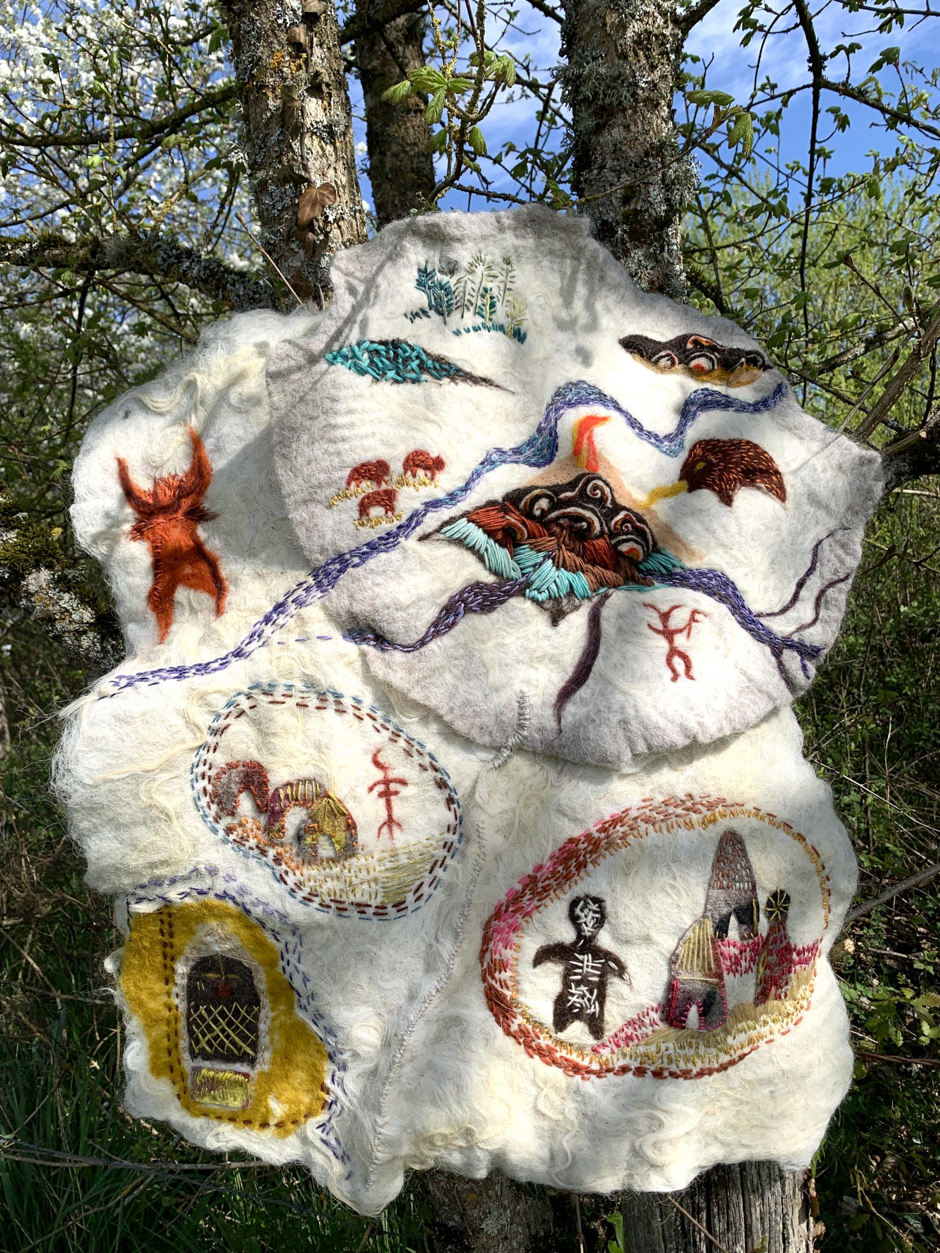 Cette série explore la notion de territoire comme espace sensible aussi bien que géographique. Les cartes qui la composent ne décrivent pas un monde réel, mais des zones mentales, mémorielles ou symboliques. Réalisées en feutre et textile, elles évoquent des paysages intérieurs, des fragments de mythes ou des lieux imaginaires, à la frontière entre cartographie et abstraction poétique.