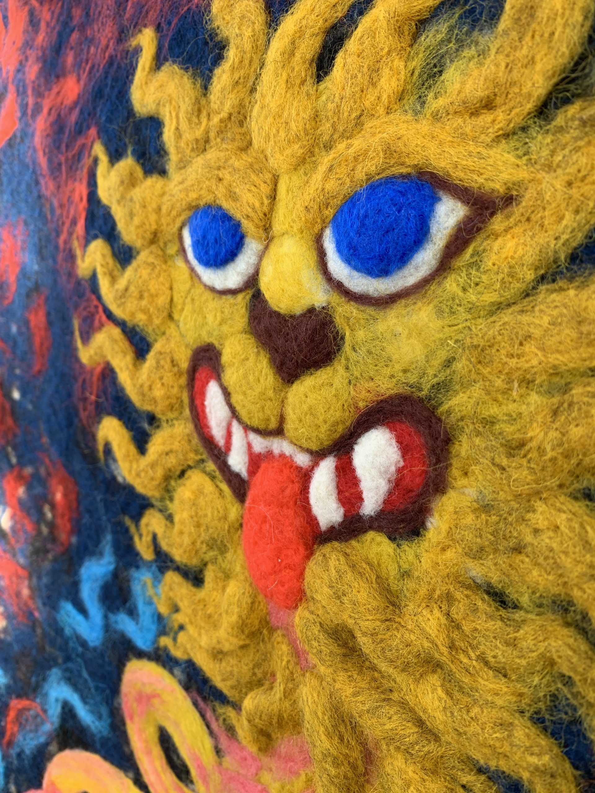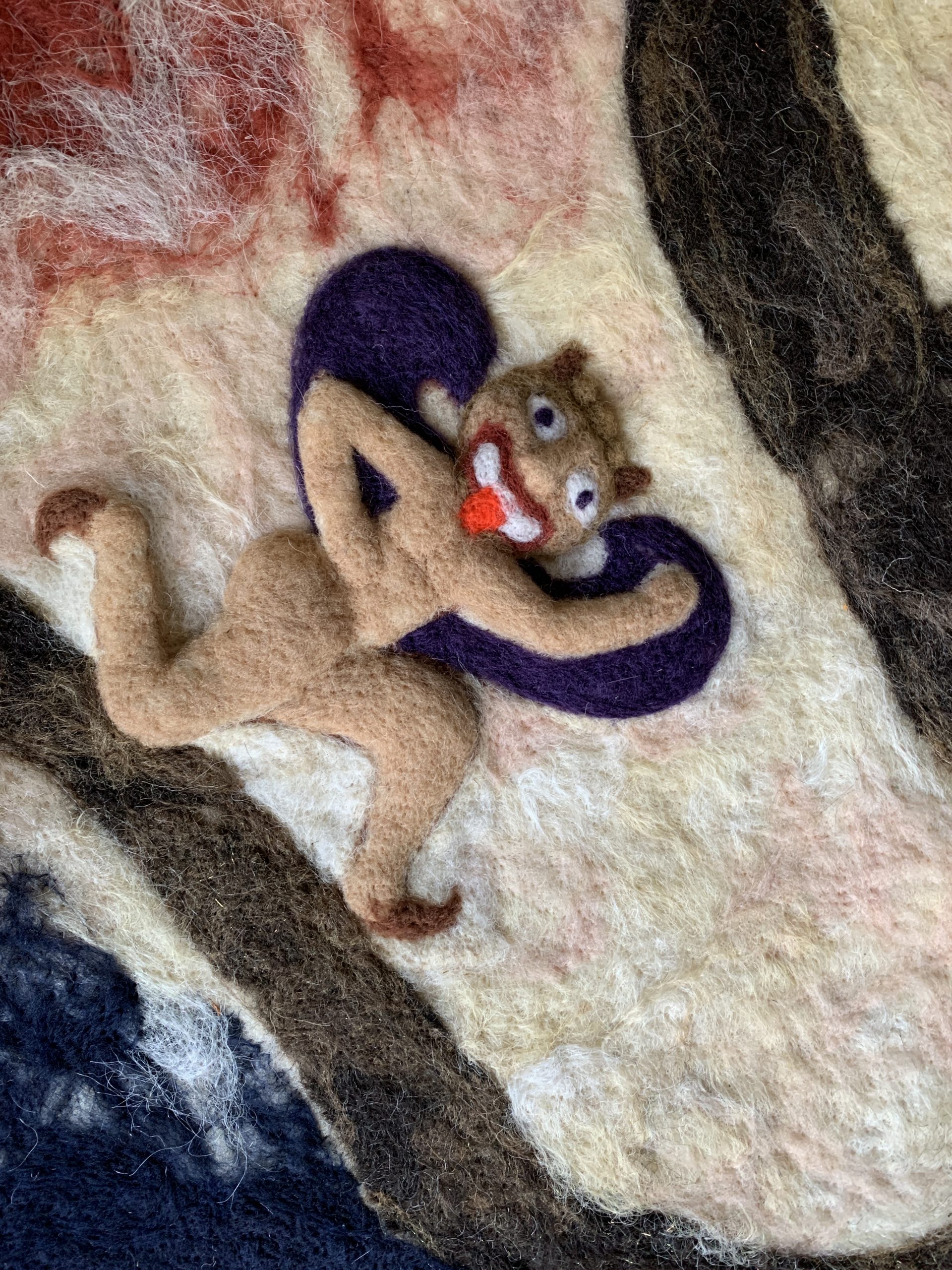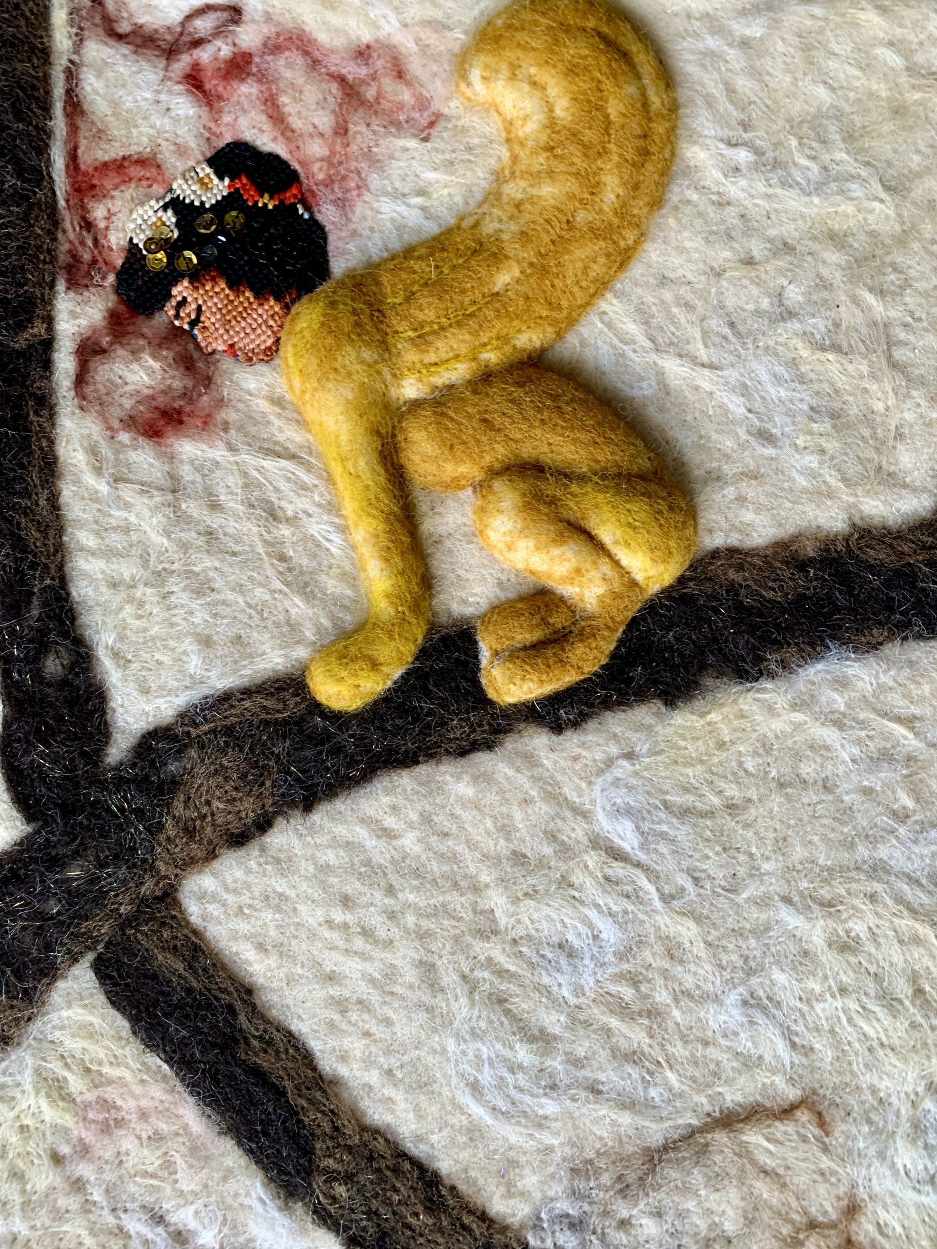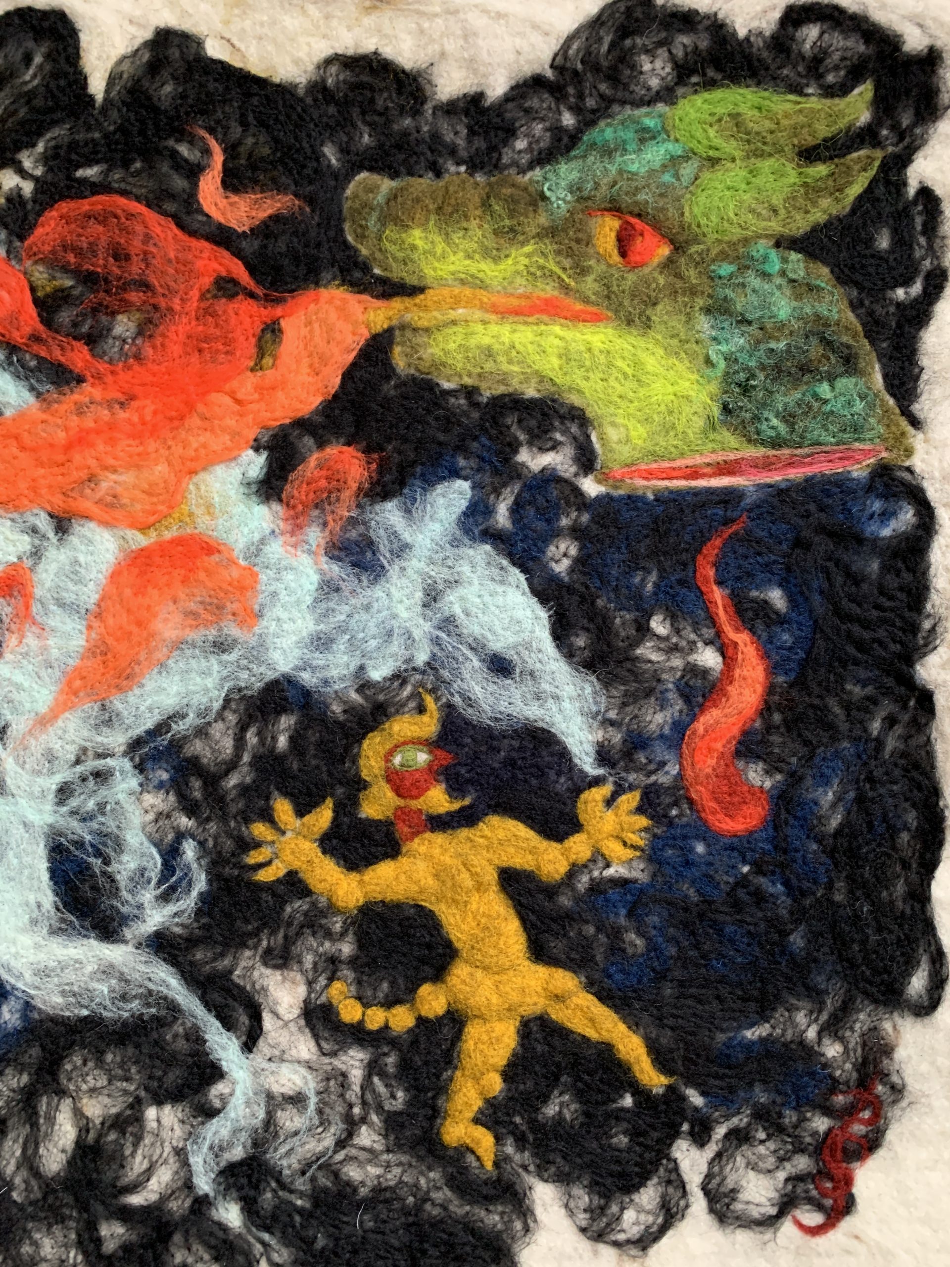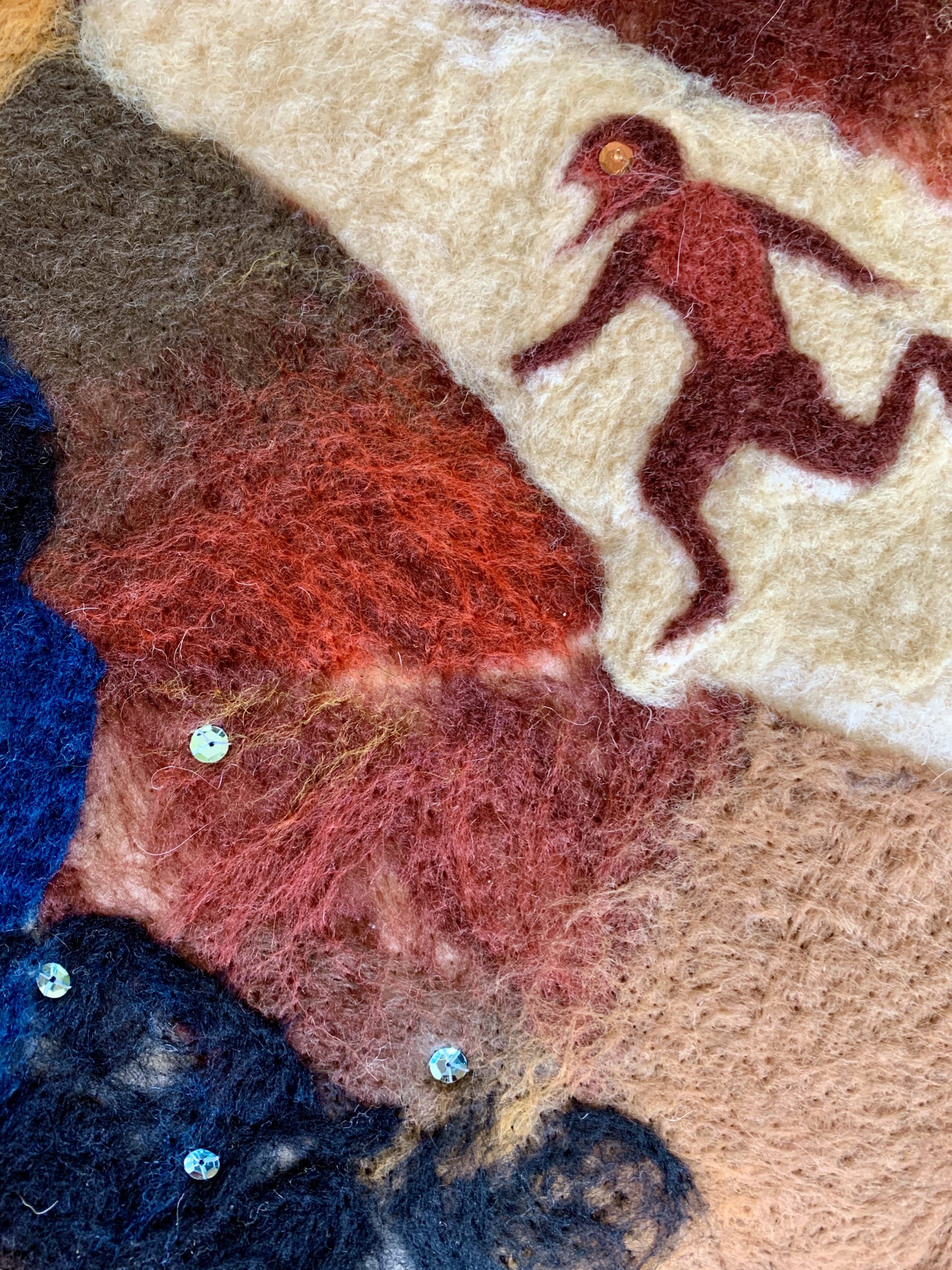 Cette série rassemble des tableaux et panneaux textiles à dimension narrative. Les œuvres fonctionnent comme des fragments de récits ouverts, où surgissent des figures (souvent hybrides) et symboles dans un lieu indeterminé. Sans livrer d’histoire linéaire, elles proposent des scènes énigmatiques, laissant au regardeur la liberté de composer sa propre lecture.