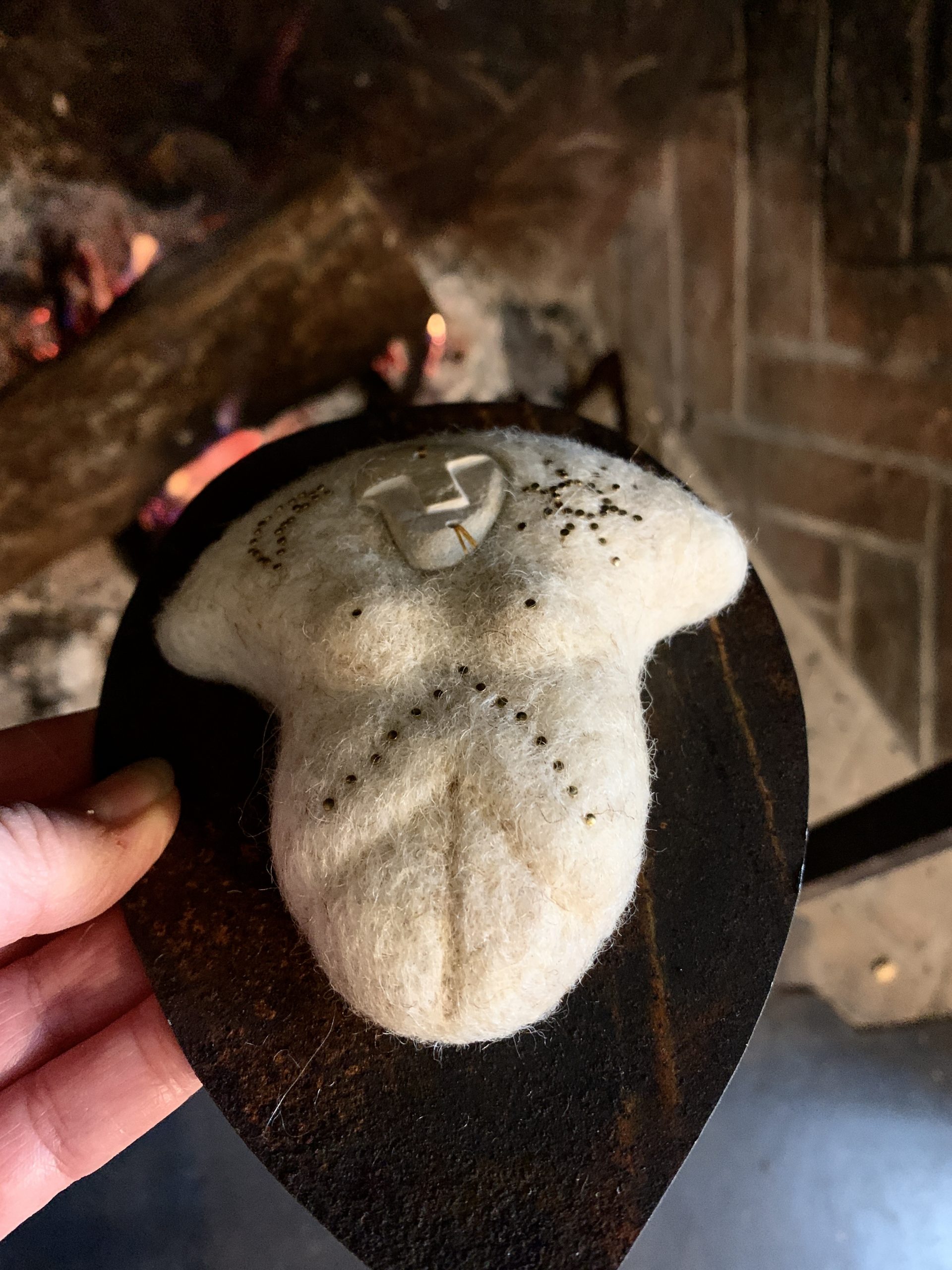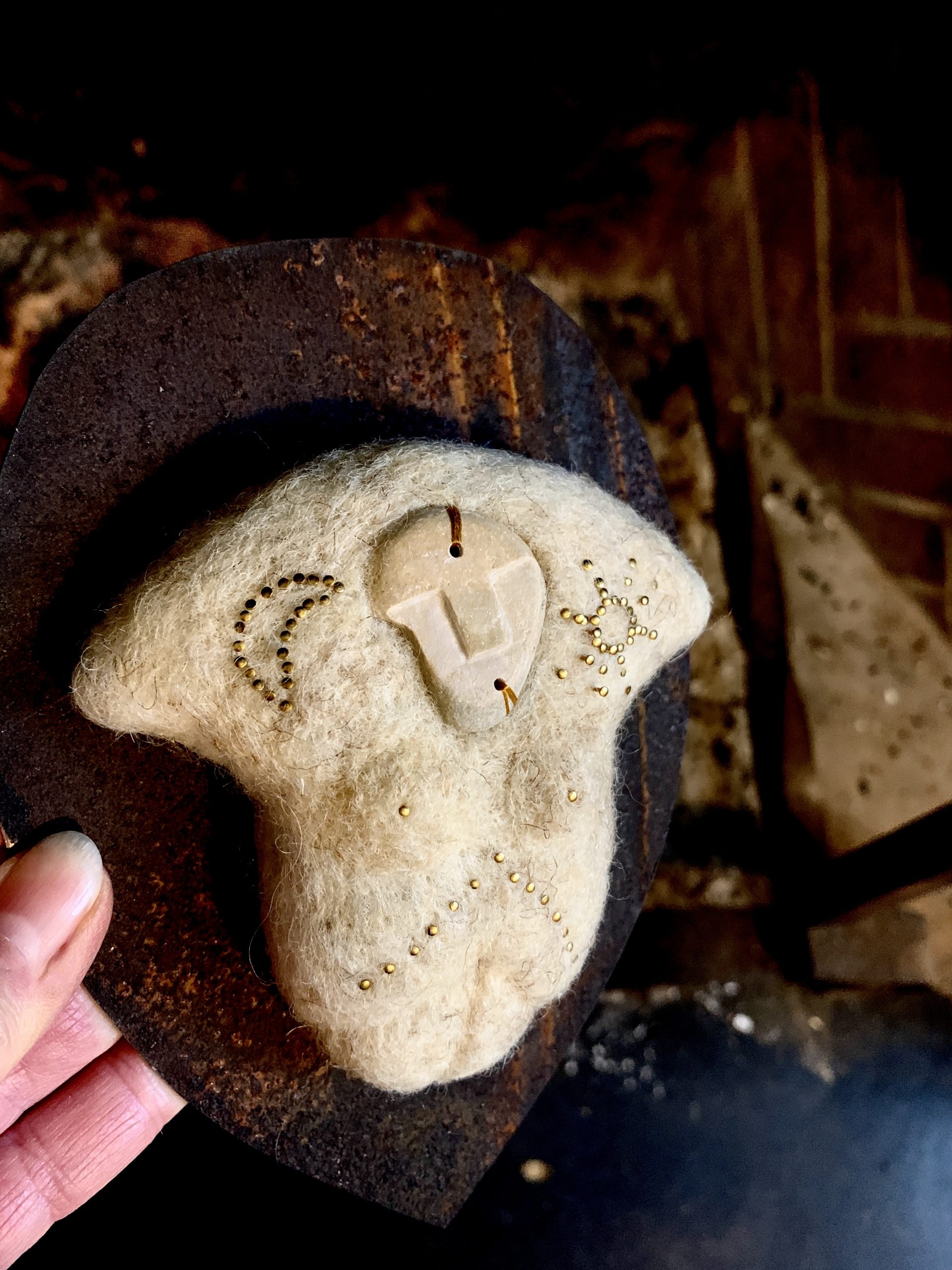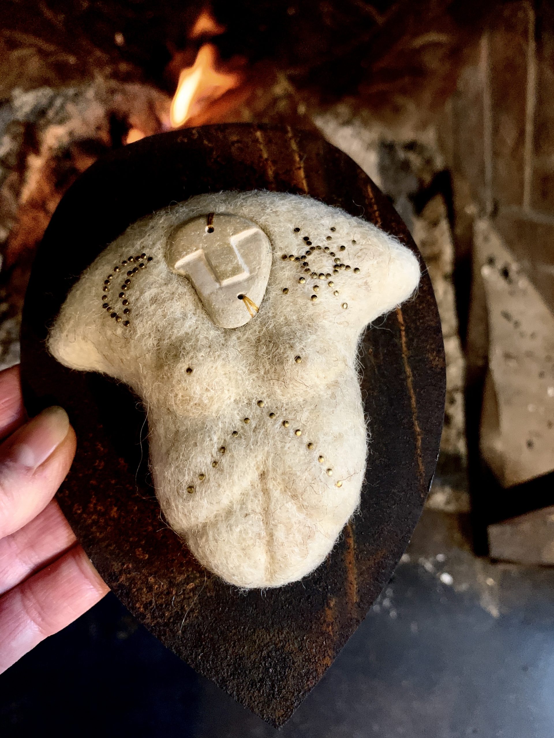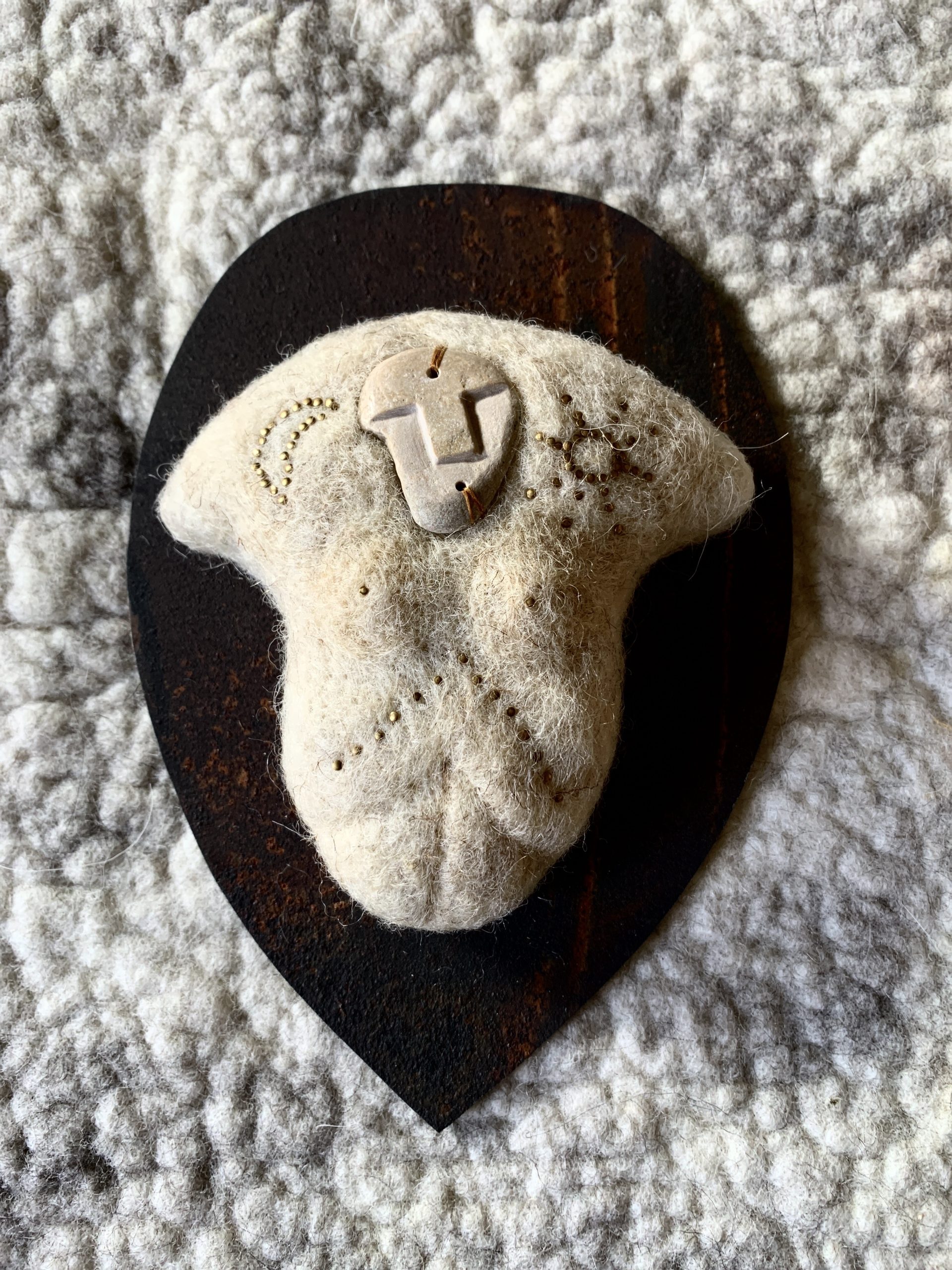 Mes sculptures en laine feutrée accueillent les masques façonnés par la créatrice Léonie Zikos, fondatrice de la marque @à la recherche de Cassiopée. Surgis de la pierre et du laiton comme des visages exhumés, ces masques murmurent une mémoire gravée dans le silence du temps…