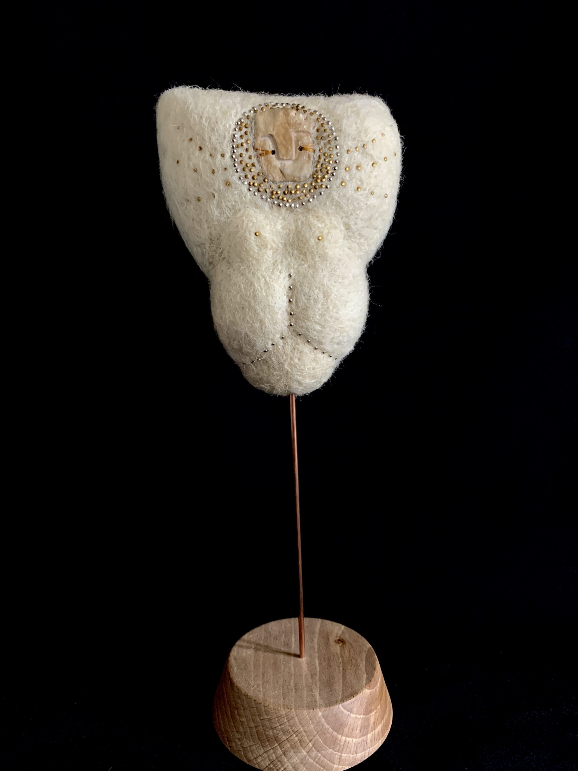 Mes sculptures en laine feutrée accueillent les masques façonnés par la créatrice Léonie Zikos, fondatrice de la marque @à la recherche de Cassiopée. Surgis de la pierre et du laiton comme des visages exhumés, ces masques murmurent une mémoire gravée dans le silence du temps…