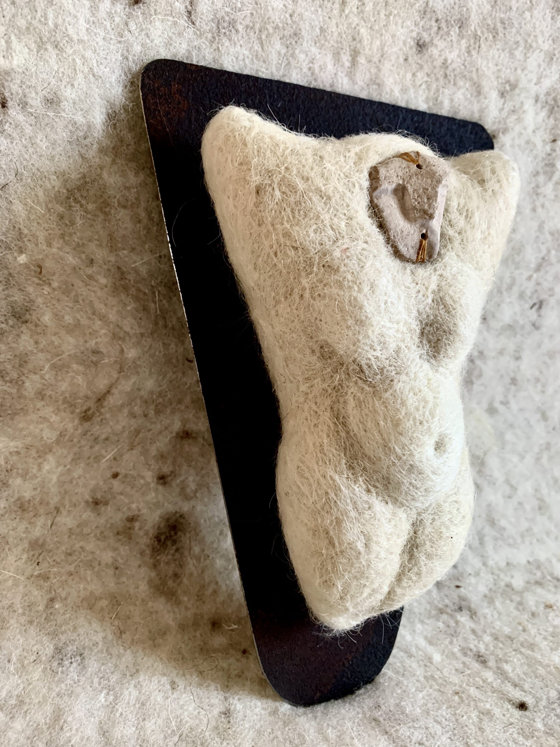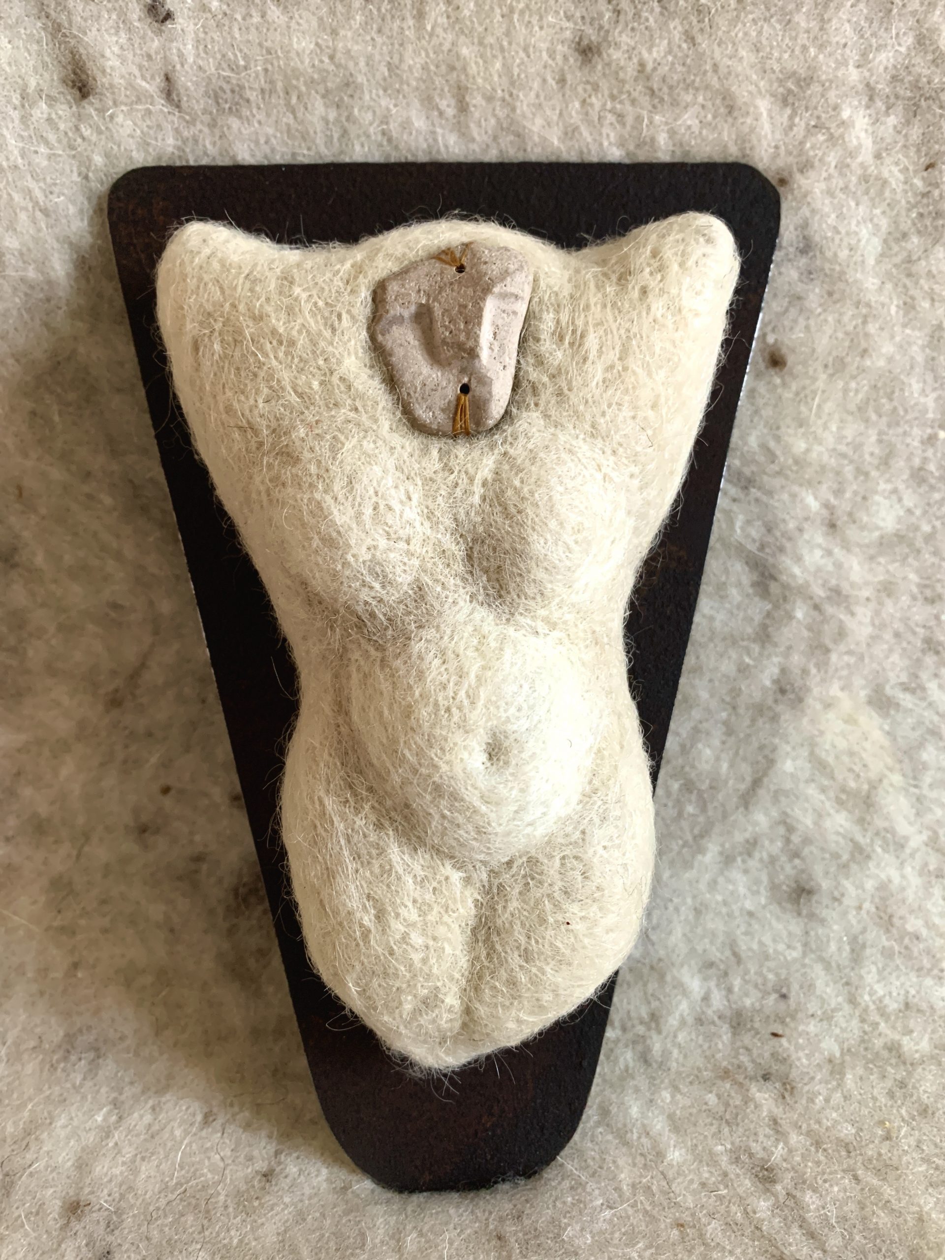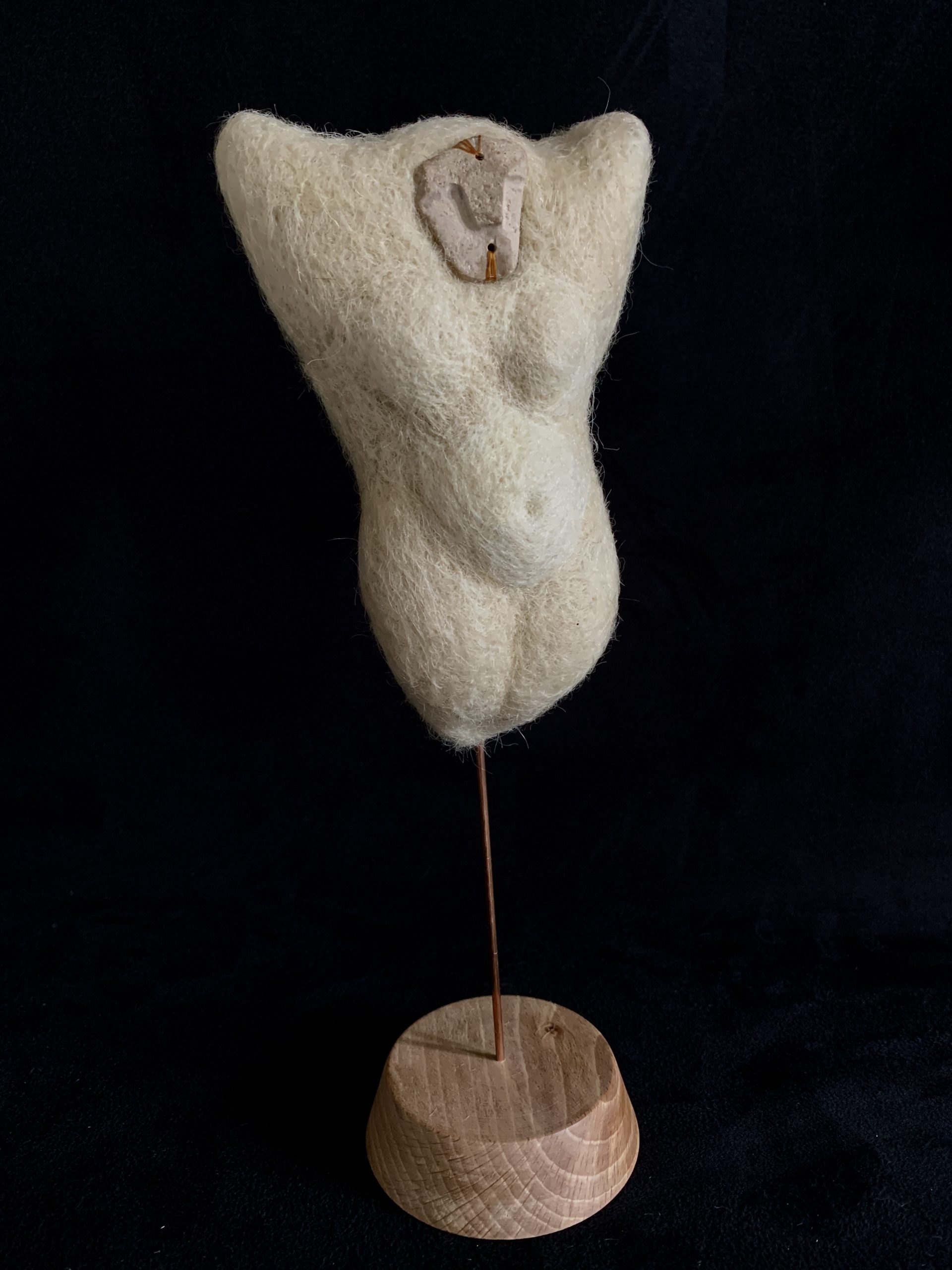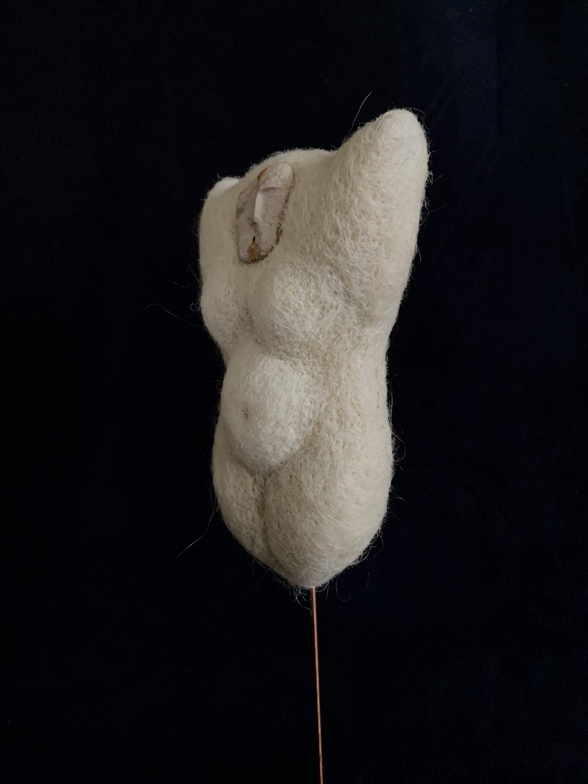 Mes sculptures en laine feutrée accueillent les masques façonnés par la créatrice Léonie Zikos, fondatrice de la marque @à la recherche de Cassiopée. Surgis de la pierre et du laiton comme des visages exhumés, ces masques murmurent une mémoire gravée dans le silence du temps…