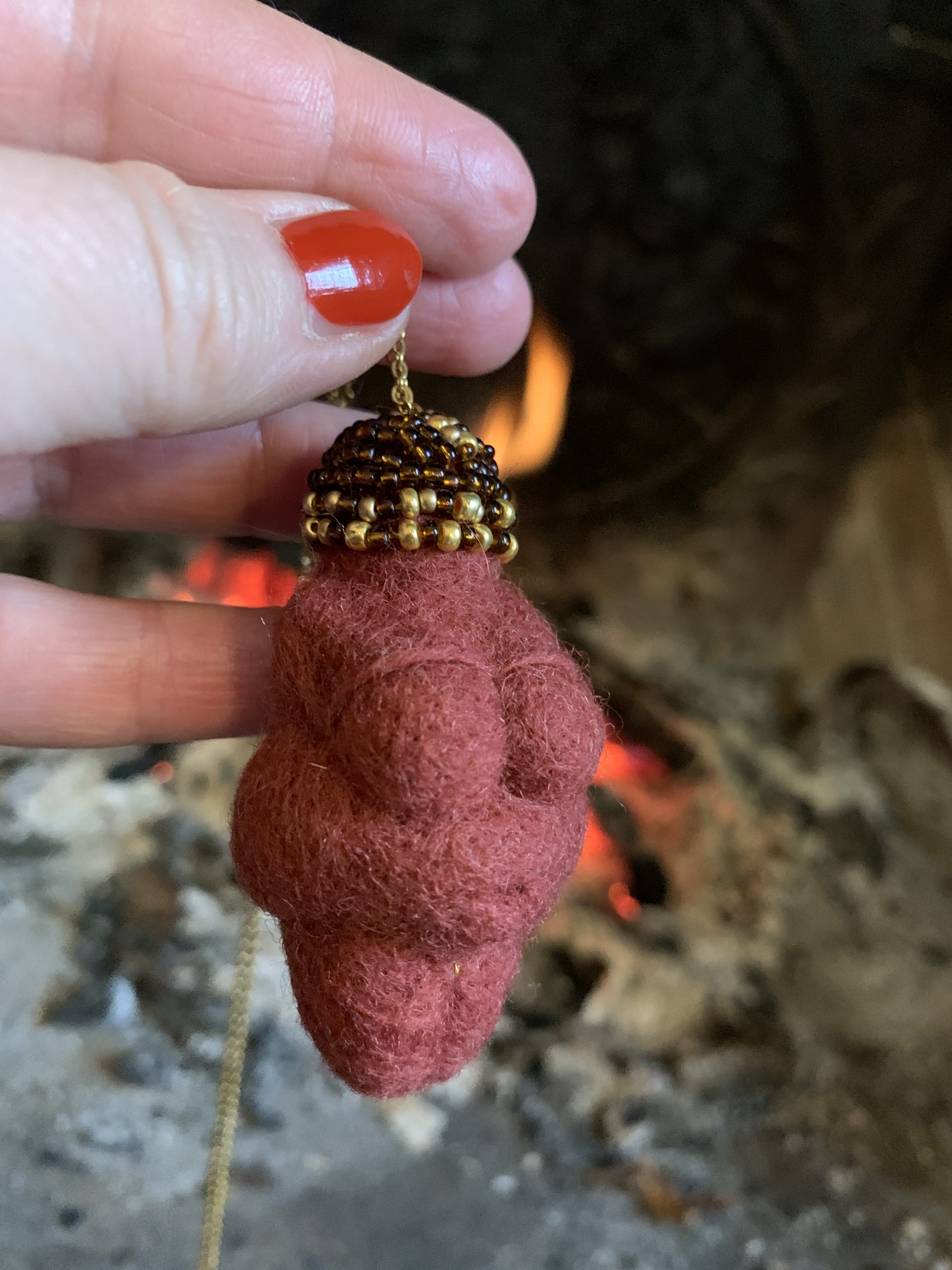 Vénus en laine feutrée à l’aiguille, sculpture textile miniature inspirée de la Vénus préhistorique de Willendorf. Un petit anneau sur la tête permet de passer une chaîne pour la porter autour du cou. Chaîne couleur or fournie.
