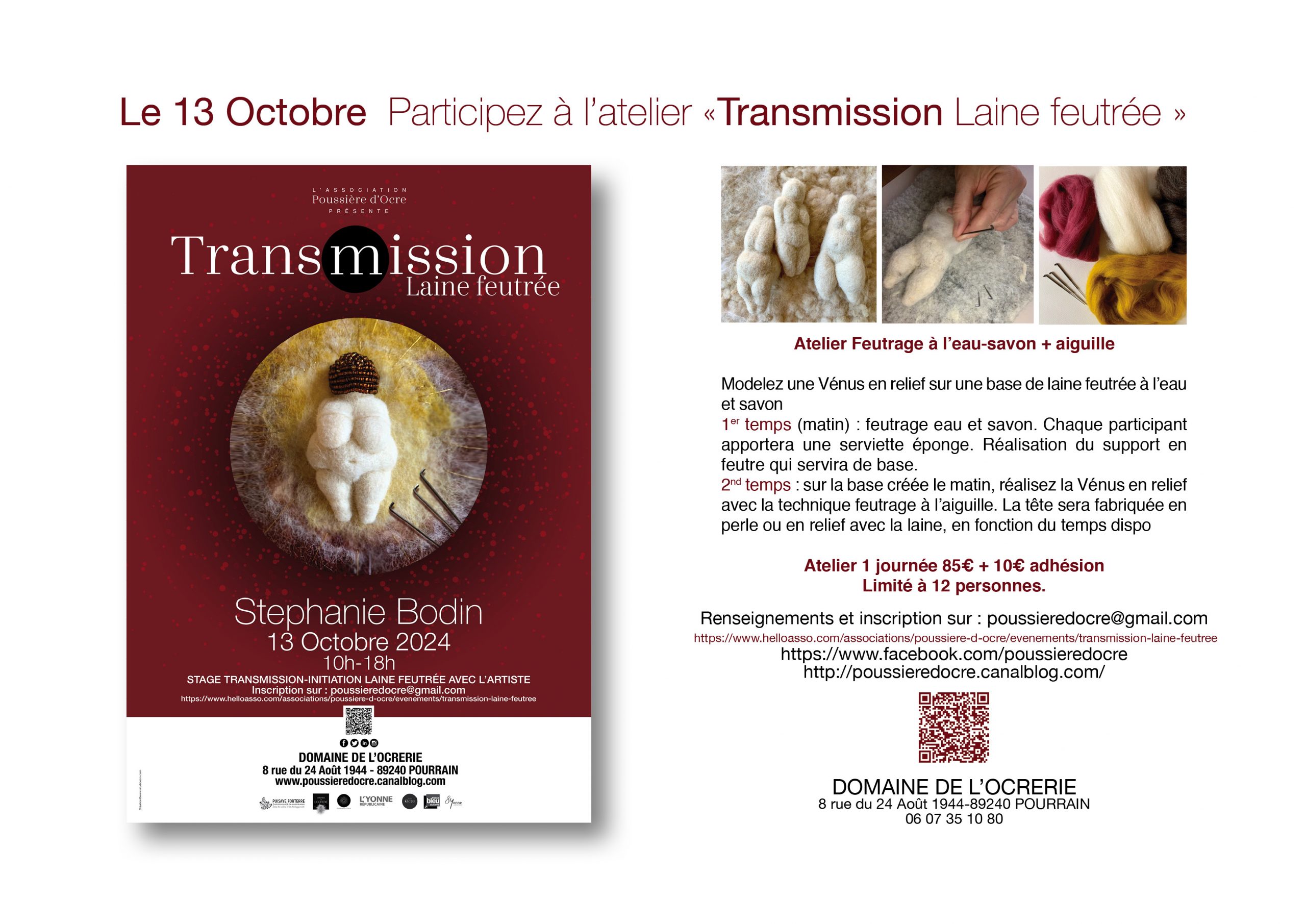 Je vous invite à découvrir la technique du feutrage de la laine cardée à l'eau et à l'aiguille …. Dans un premier temps, nous réaliseront une petite pièce de feutre à l'eau chaude savonneuse. Ensuite, nous ferons la Vénus sur ces support, en relief. Différentes couleurs de laines seront proposées (possibilité de fond blanc et Vénus en couleur). Pose de perles et paillettes…Pour adolescents et adultes, pas de pré-requis.