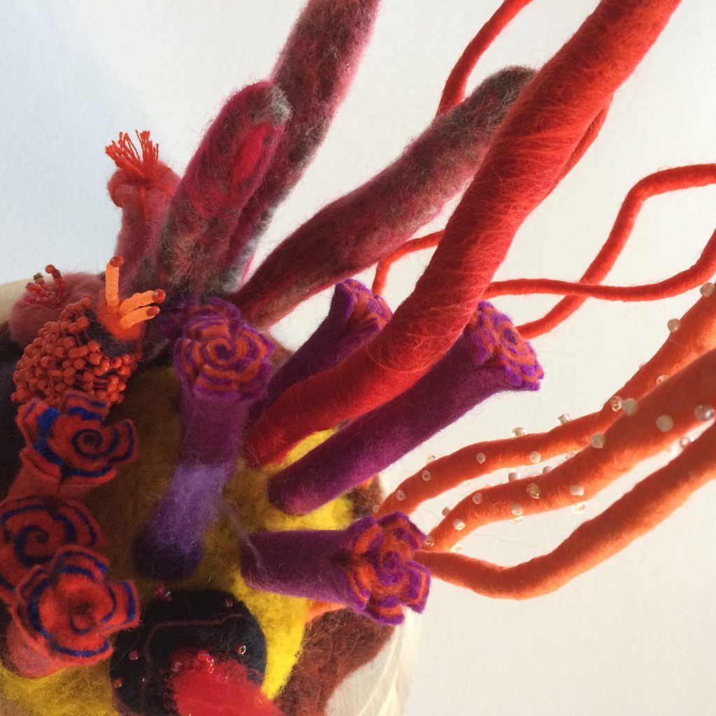 Je vous invite à découvrir deux techniques du feutrage de la laine cardée : à l'aiguille et à l'eau…pour réaliser un ensemble de coraux imaginaires…il y aura aussi la pose de perles…Différentes couleurs de laines et de perles seront proposées. Pour adolescents et adultes, pas de pré-requis.
